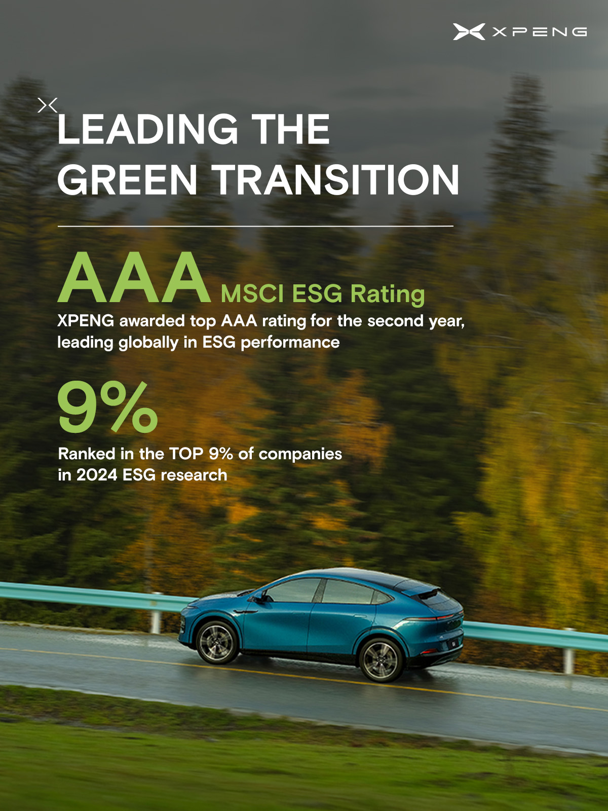 Munich, le 15 novembre 2024 – XPENG, entreprise chinoise de haute technologie parmi les leaders du secteur, a de nouveau obtenu cette année la note ESG la plus élevée décernée par MSCI : la prestigieuse note « AAA » souligne le rôle exemplaire de XPENG en matière d’initiatives environnementales, sociales et de gouvernance (ESG – Environmental, Social & Governance), et récompense ses performances remarquables dans des domaines tels que les technologies propres.